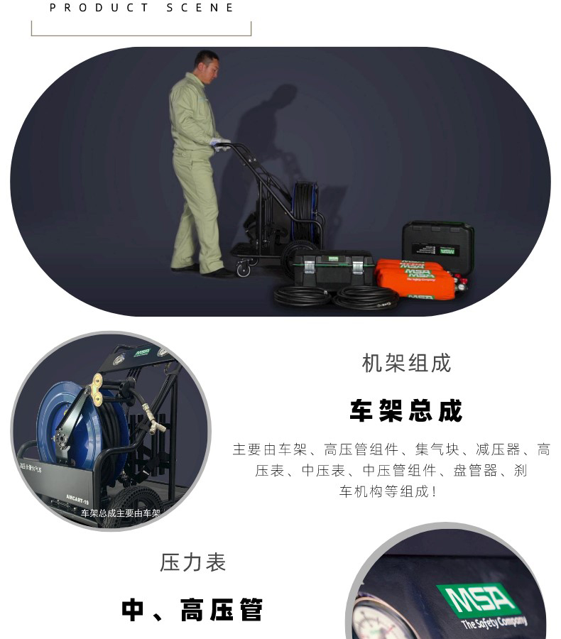 在使用本产品过程中,中压供气管的总长度不得超过 80 米(推车自带中压供气管 加延长管供气管的总长度)。 在 IDLH 环境使用时,必须和逃生呼吸器配合使用。